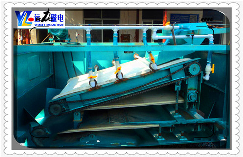 1、濕式平板高場強磁選機工作時,物料流向和卸鐵係統成反向逆流式,